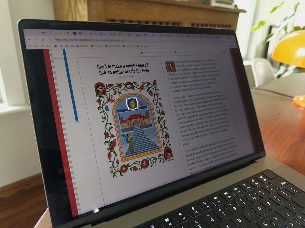 The illustrations for Digital Divinity make use of this effect in a brilliant (literally) way by masking a pure white, HDR video such that parts of the illustration glow with an ethereal brightness. For devices that support displaying HDR content brighter than the rest of the screen, the effect is stunning.
