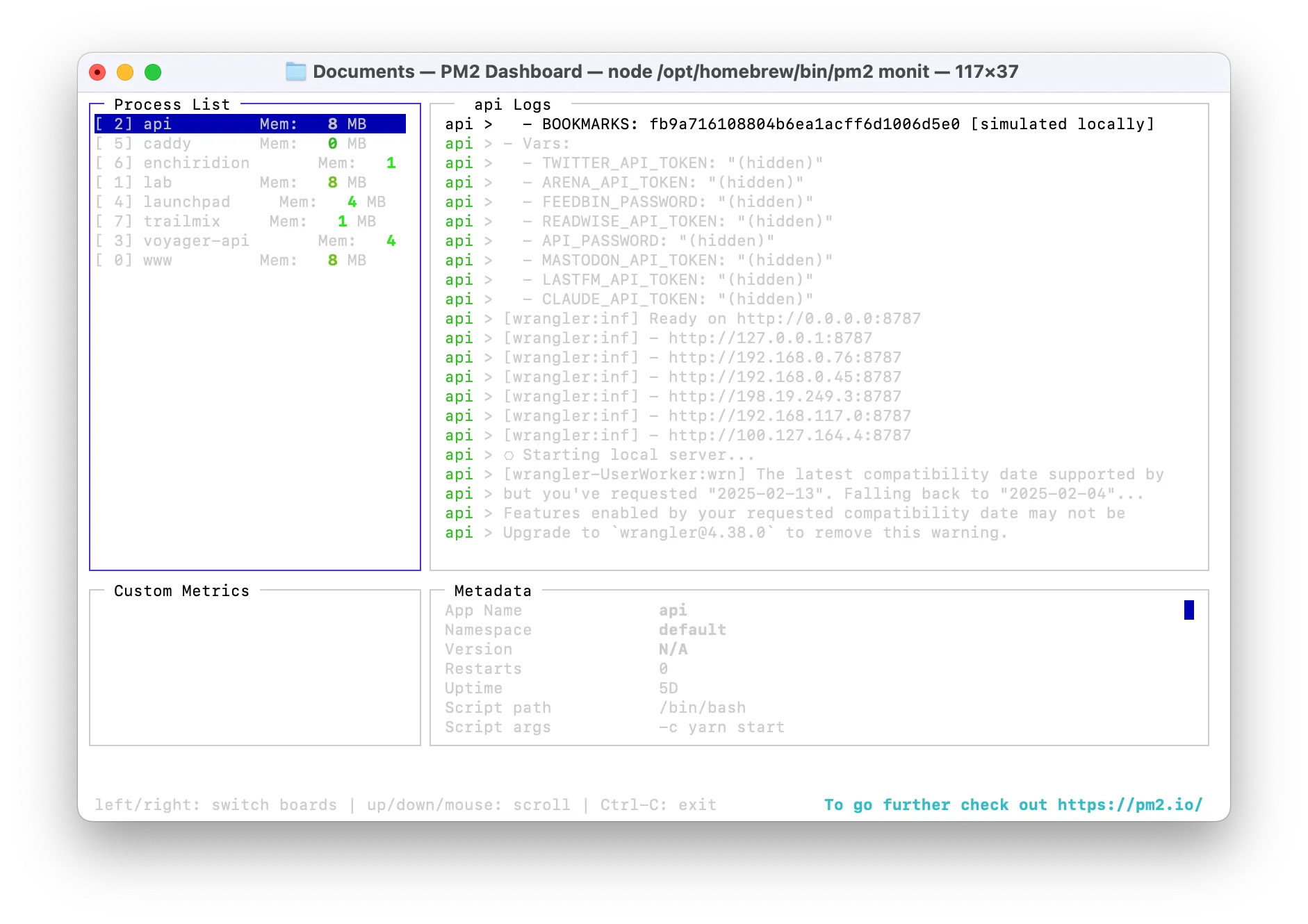 Any app running on your machine that is exposed on a local port will be accessible over your Tailnet, but we need to make sure that those apps are always running and restart automatically if, say, our machine reboots or the app crashes. For this, we’ll use a process manager called PM2.