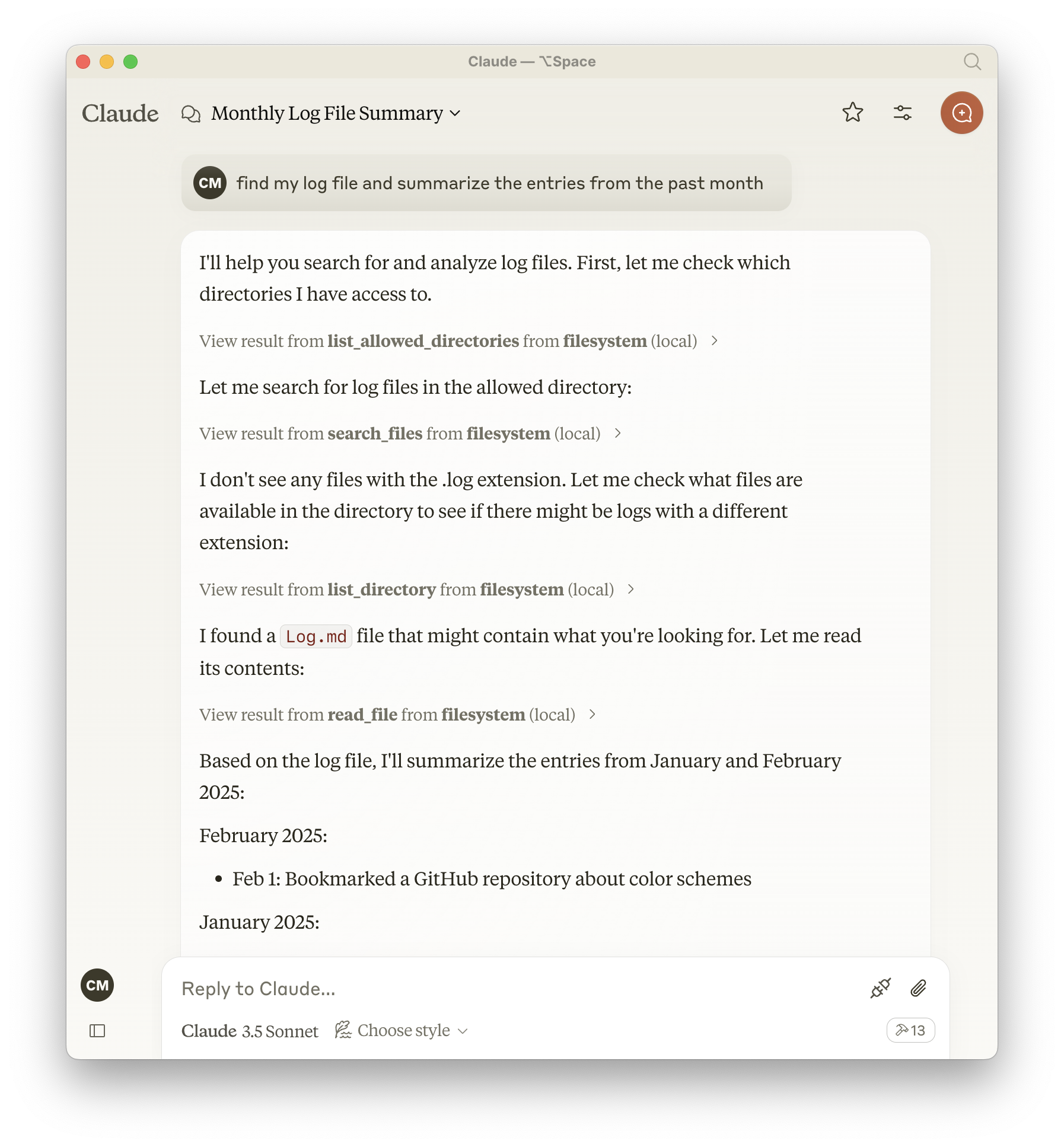 Here’s a screenshot from my very first time using the filesystem MCP server in Claude. I asked it to find my log file (the file I use for running notes throughout a year) and summarize the entries from the past month: